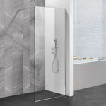 Mampara de ducha fija de vidrio transparente templado de 8mm, con perfiles cromados.