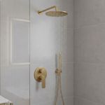 Mezclador tina y ducha con cuerpo empotrado terminación oro mate, monomando y monoforo.